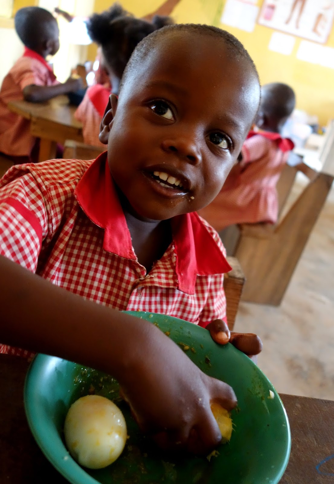 Dzień zaczyna się od porannego spotkania na patio szkolnym. Modlitwa, przywitanie wszystkich, dzieci rozchodzą się do klas. I zaczynamy nasz poranny maraton. Trochę nauki, więcej zabawy, zajęcia sportowe, co niektórym zdarzy się przedwczesna drzemka na stole. Dzieci nie usiedzą w miejscu dłużej niz 10 minut więc pod ręką mamy sporo piosenek, wierszyków, wyliczanek. Pierwsze dni są raczej płaczące, bo dla wielu z nich to pierwsza dłuższa rozłąka z mamą, ale po kilku dniach czują się jak u siebie. Staram się dzielić swoją uwagę na wszystkich, nie zapomnieć o przytulańcu, buziaku czy chwili spędzonej z każdym choć troszeczkę, bo widzę że jak wielkie to ma dla nich znaczenie. King David tak nazywamy naszego malucha przyszedł dziś do szkoły zdecydowanie nie w sosie. Usiadł w rogu i nie pozwolił sie nikomu dotknąć. Przekupiłam go kawałkiem pomarańczy, usiadł na kolanach i zaczeliśmy się bawić. Po kilku minutach jakby zapomniał, że obraził się na cały świat. Wystarczy kilka buziaków i chwila tulenia. Prawdopodobni nikt w domu nie przykłada do tego większej uwagi, często brak im pieszczot, poczucia bezpieczeństwa, miłości. Nawet w szkole powtarzam do znudzenia nauczycielom, nie ignorujcie tego małego człowieka w ciele dziecka. Bo to jak wy ich dzisiaj traktujecie tak oni będą traktować innych. Pracuje wraz z 7 osobową załogą. Poranne zajęcia prowadzę w klasie Pani Grace. Ponad 30 maluszków 2-3,5 latka to jeszcze maluchy. Więc dwoimy się i troimy by zabawiać nasze dzieciaki. Piosenki, gry słowne, zabawy ruchowe są najlepszą aktywnością. Mam tu ze sobą cudowną wolontariuszkę Mabel bez której nie wyobrażam sobie moich działań. Biorac pod uwagę, że większość z tych dzieciaków nie mówi po angielsku gdyby nie ona, nie byłabym w stanie za wiele tu zrobić. Po południu czeka na mnie 20 osobowy wulkan energii w klasie Pana Kofiego. Ta grupa to jest moc, trzeba wykazać się tu sporą wyobraźnia i kreatywnością by nasze przedszkolaki chciały usiedzieć w miejscu choćby chwile.
